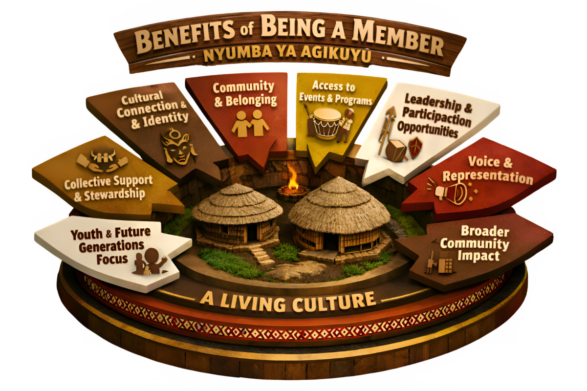 Nyũmba ya Agĩkũyũ is a welcoming community in Canada open to everyone—Agĩkũyũ people by birth, through marriage, affiliation, or friendship, as well as anyone eager to learn about our rich culture. Our house is big, open, and inclusive, where everyone is embraced as family. Guided by our core pillar of unity, we celebrate heritage, foster connections, and share the values that make the Agĩkũyũ identity vibrant and enduring.