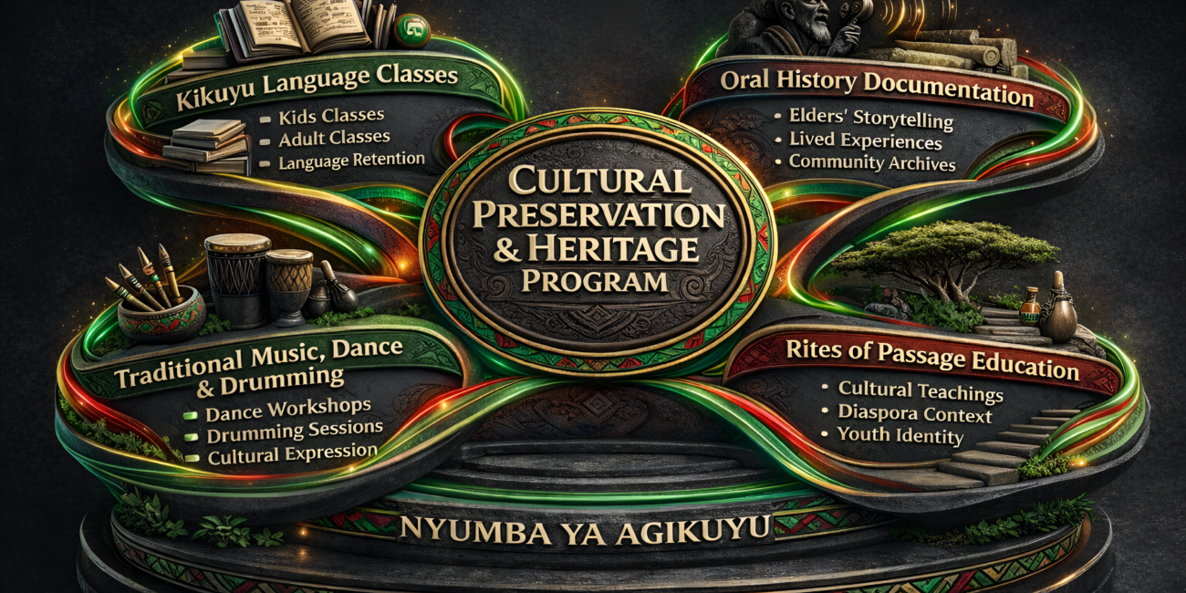 The Cultural Preservation & Heritage Program at Nyumba Ya Agikuyu is dedicated to safeguarding Agikuyu language, values, traditions, and history for both current and future generations, particularly within the diaspora. This program exists to ensure that cultural identity remains living, accessible, and relevant, strengthening community connection, belonging, and intergenerational continuity.